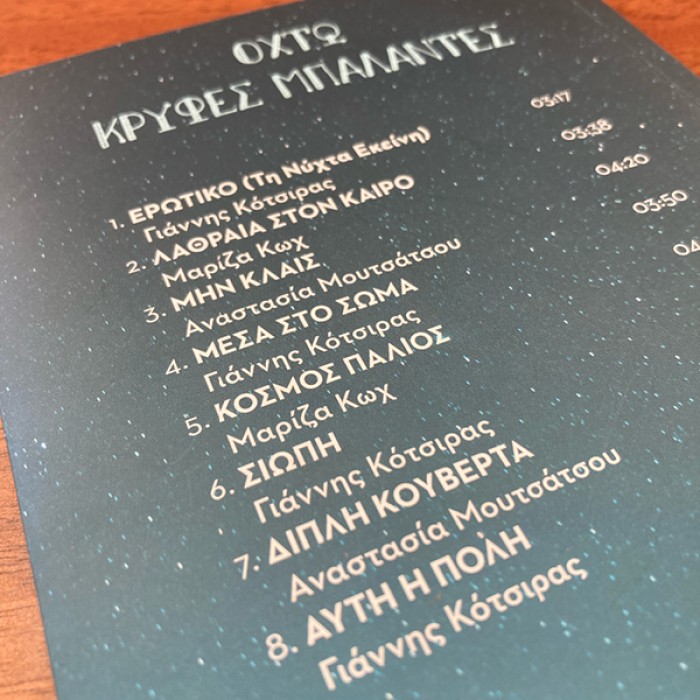 Το υλικό των οκτώ τραγουδιών μου, σε στίχους της πρωτοεμφανιζόμενης δισκογραφικά Μάγδας Κατσάκου, ευελπιστεί να εκτεθεί στο κοινό με το Όγδοο ως οδηγό. Να βρεθεί ανάμεσα και σε άλλες παραγωγές για να γίνει… λίπασμα· για ένα ύφος που θεωρώ πως έχει αρχίσει να απουσιάζει από τις ραδιοφωνικές ακροάσεις και την ισότιμη διάδοση. Ελπίζω πως οι «Οχτώ κρυφές μπαλάντες», θα μπορέσουν να είναι ένα βήμα, μαζί με άλλα, για να συναντήσουν το ευρύτερο κοινό…